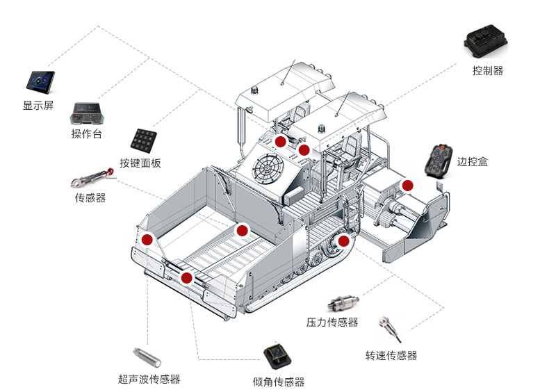快盈智能摊铺机解决方案整合了感知技术、自动控制系统和数据分析算法,实现了摊铺机高度智能化操作。通过实时获取路面信息和实时调整施工参数,使摊铺机操作更加精准、高效和可靠。